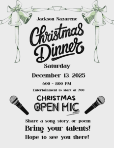 All are welcome to attend! This is a church potluck. The meat and drinks will be provided. We welcome you to bring a side dish or a dessert to share so that we may sample your specialties! (It’s not necessary to bring anything! We just invite you to attend!) If you’d like to sing or read a poem, we would love to hear your talent!